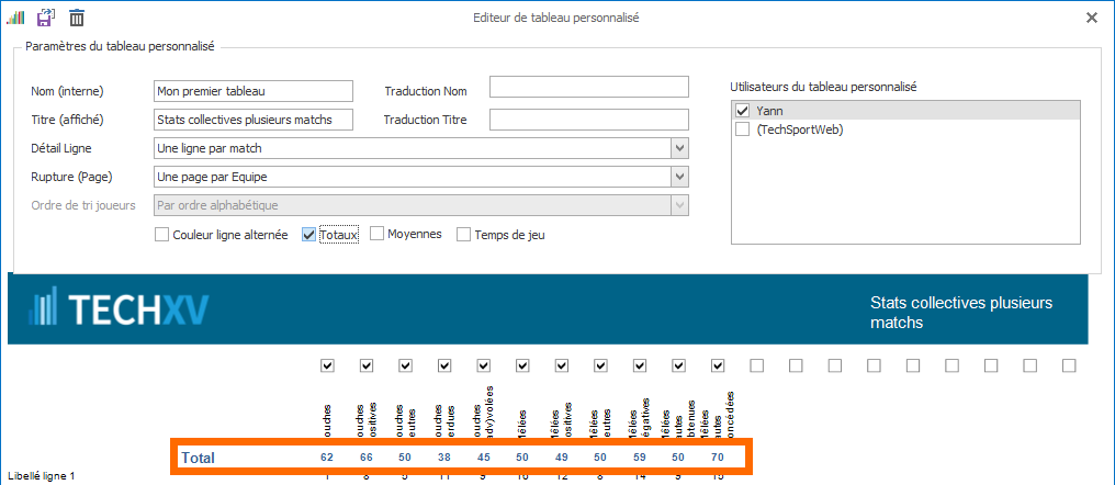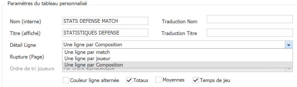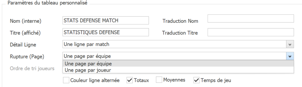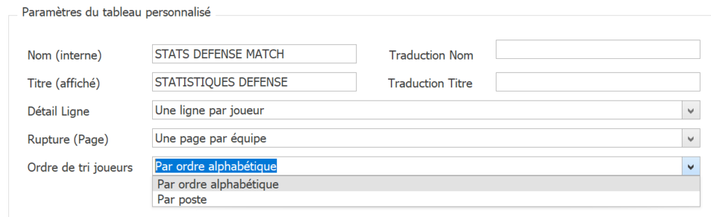 3. Indiquez un Ordre de tri joueurs pour trier les lignes du tableau, soit par ordre alphabétique, soit par poste, lorsque le contenu des lignes du tableau est chargé avec des stats individuelles.