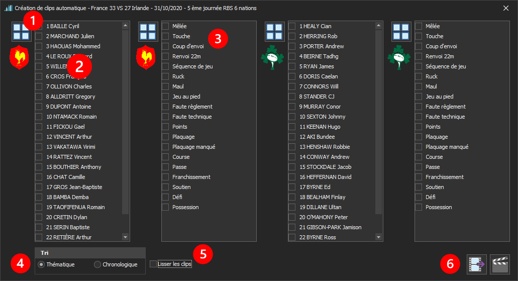 ▪Exemple : Si vous cochez les cases "Passe" et "Mêlée", 2 clips seront crées pour chaque évènement et ils seront triés selon leurs critères : les passes courtes, puis les passes longues et dans l'autre les mêlées positives, puis les mêlées négatives...
