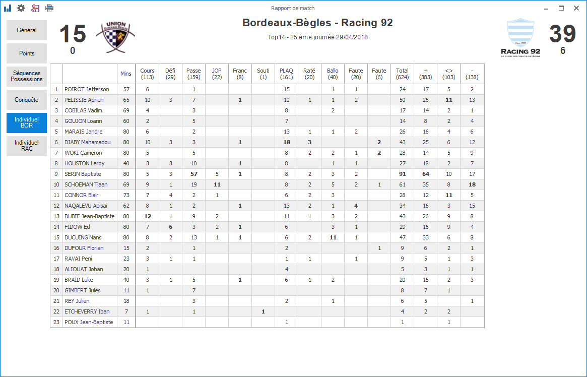 Une Grille individuelle est un tableau de stats vidéo contenant des colonnes qui affichent les statistiques des joueurs. La particularité des grilles individuelles est que chaque nombre est lié aux stats vidéo correspondantes. Un double clic sur une valeur affiche automatiquement les extraits vidéo. Pour ce faire, vous utiliserez des évènements, des rôles et des filtres prédéfinis TechXV et des filtres personnalisés.