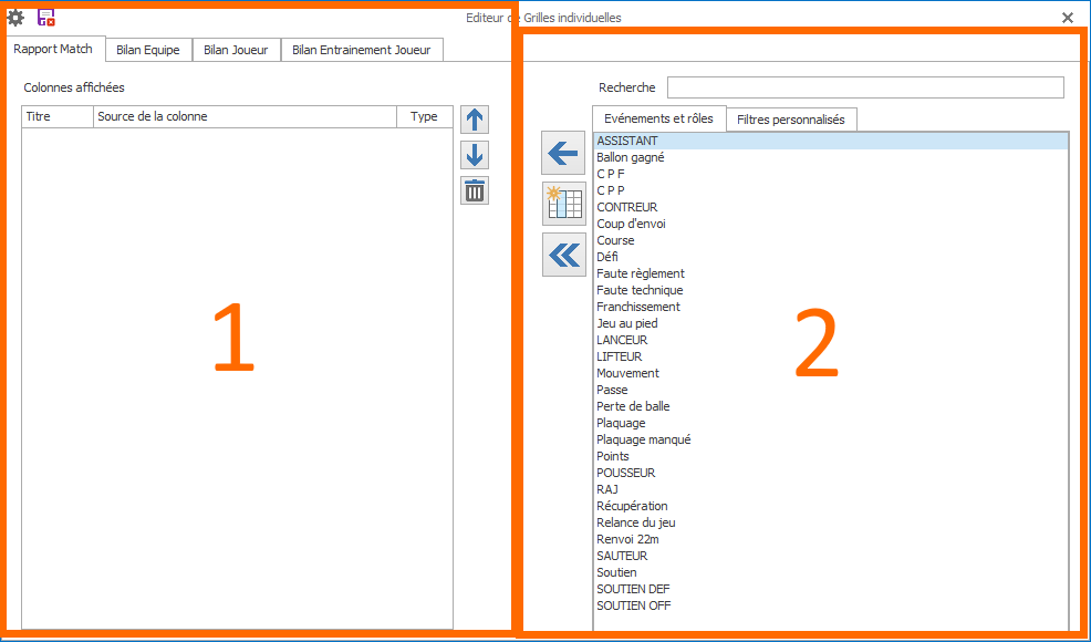 oEvènements et rôles : Permet d'afficher et de sélectionner les évènements et les rôles actifs correspondant au type de grille (Match ou Entraînement).